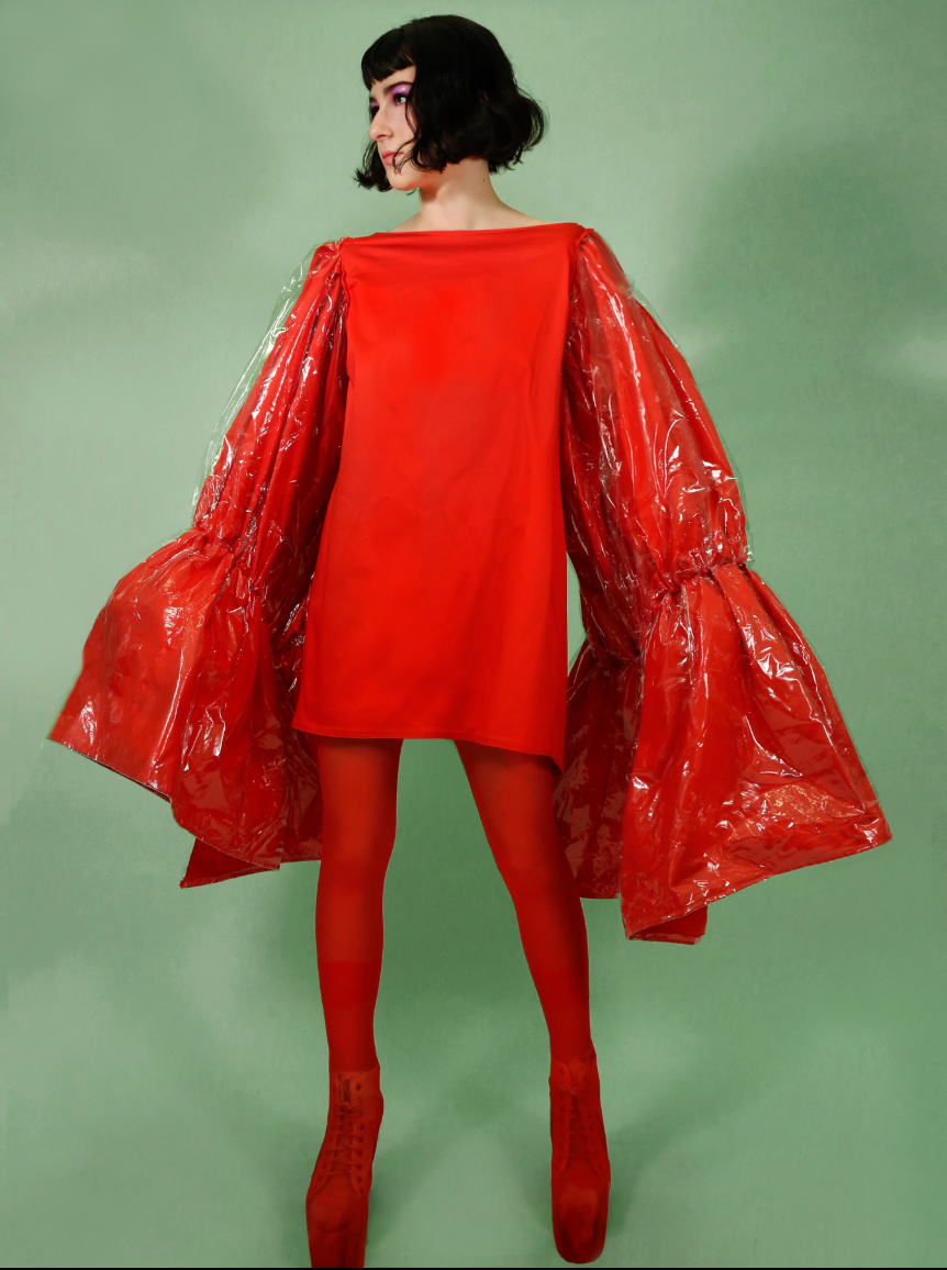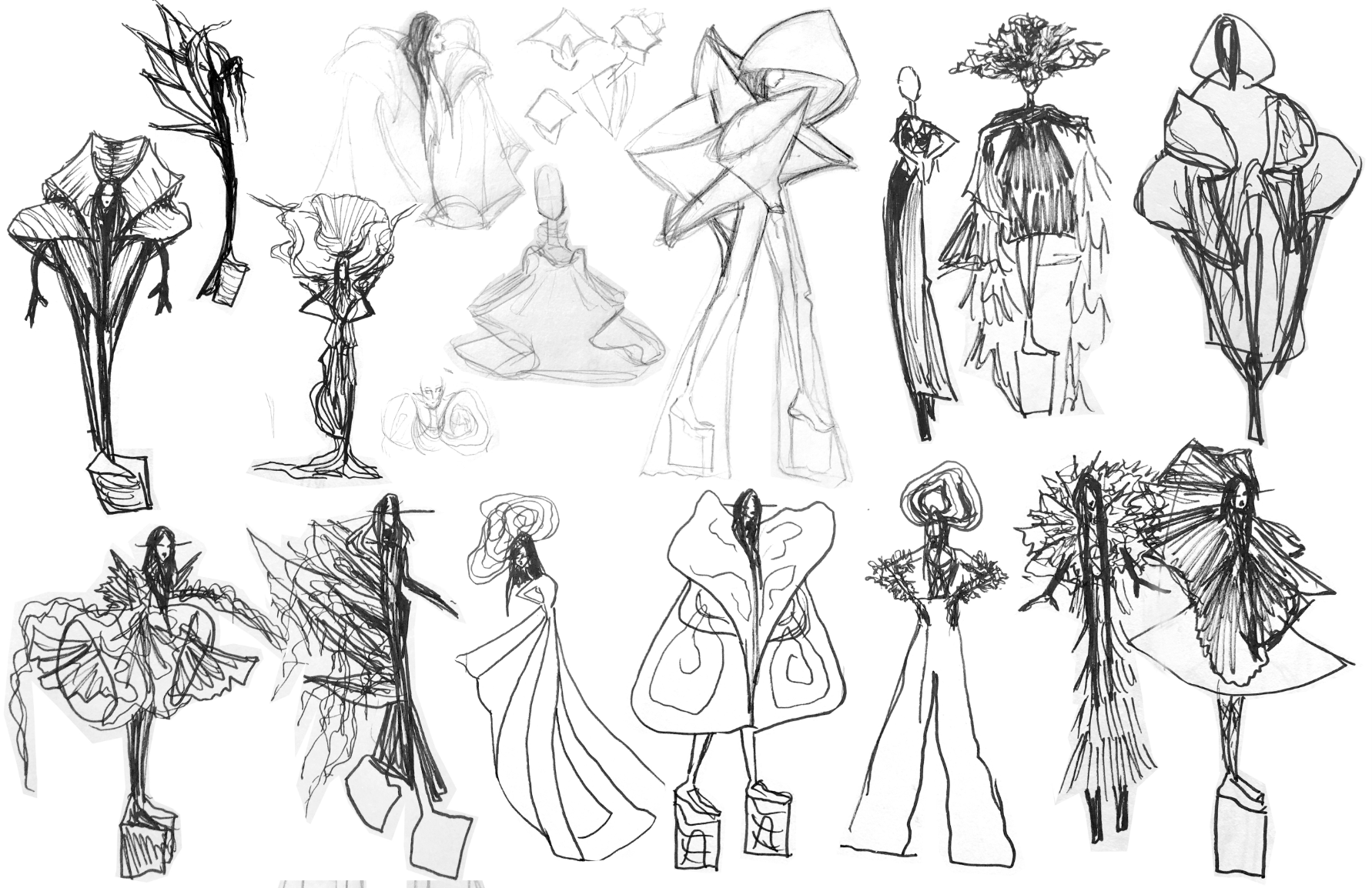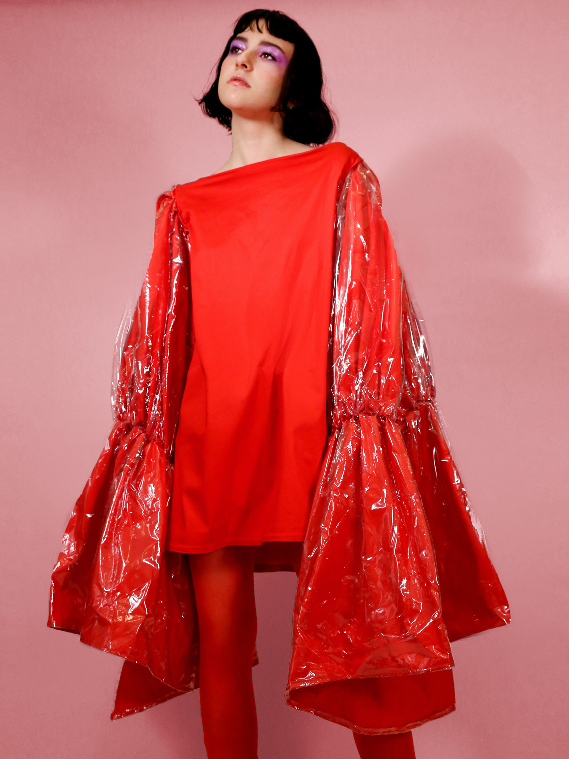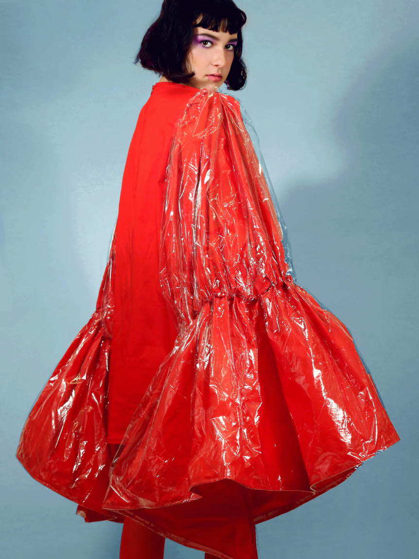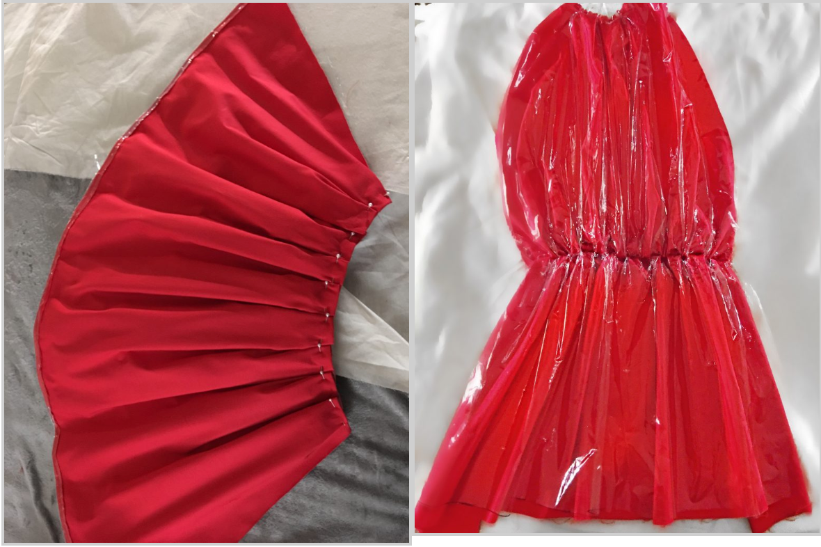 This collection explores distorted silhouettes from botanical forms that have been artificially reproduced. The oversized pleating and clear vinyl coating crumpled into a fabric form resembles a plastic flower.
