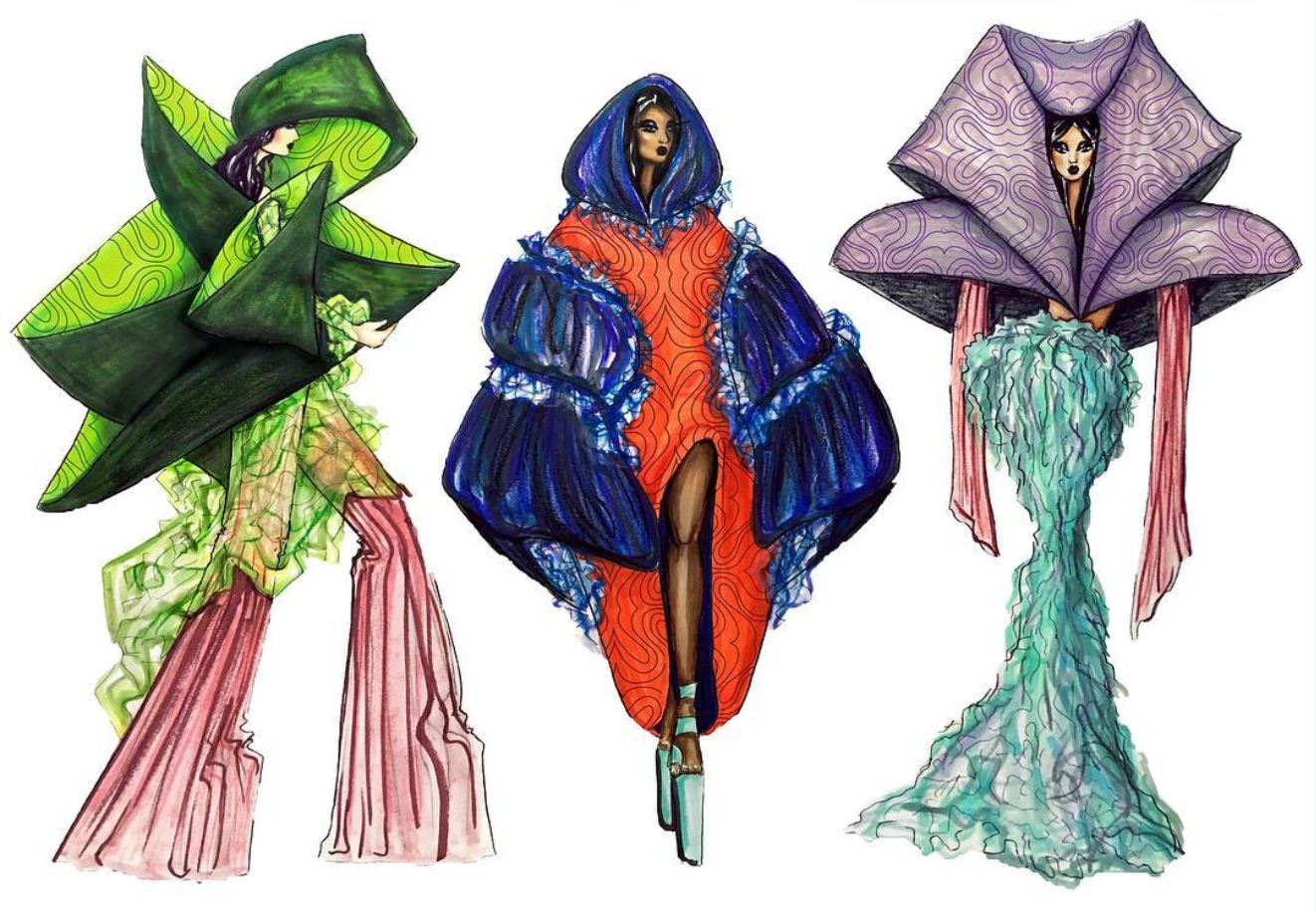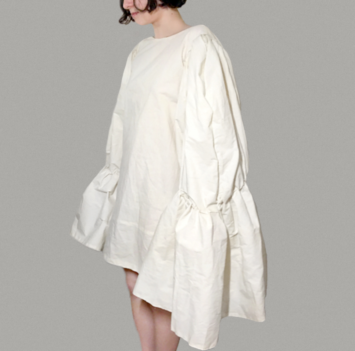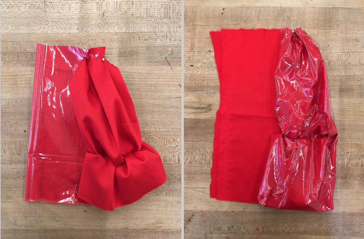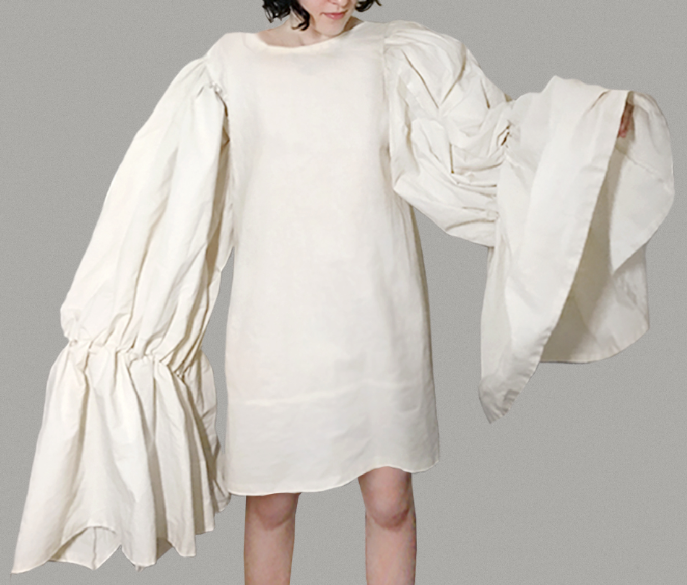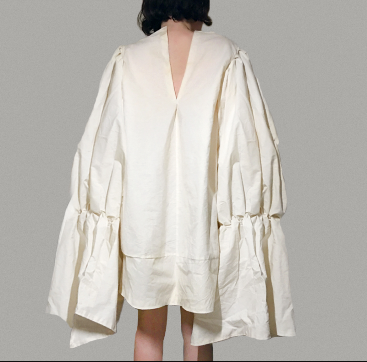 This collection explores distorted silhouettes from botanical forms that have been artificially reproduced. The oversized pleating and clear vinyl coating crumpled into a fabric form resembles a plastic flower.